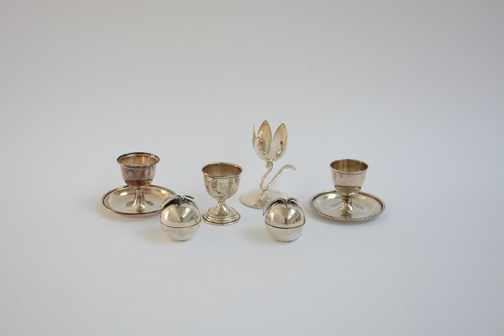 Lotto in argento composto da quattro portauovo e due scatolette a forma di mela in argento. Italia, sec. XX (gr. 250) (lievi difetti)