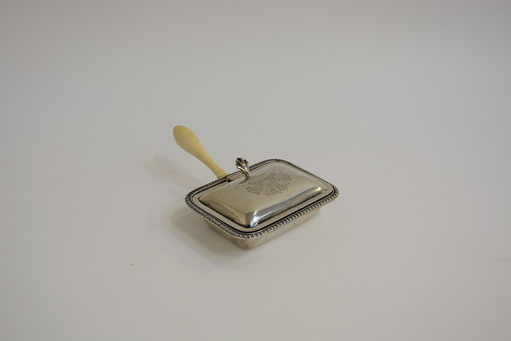 Raccoglibriciole in argento di forma rettangolare con stemma inciso e manico in osso (gr. lordi 370) (cm 10,5x20,5) (lievi difetti)