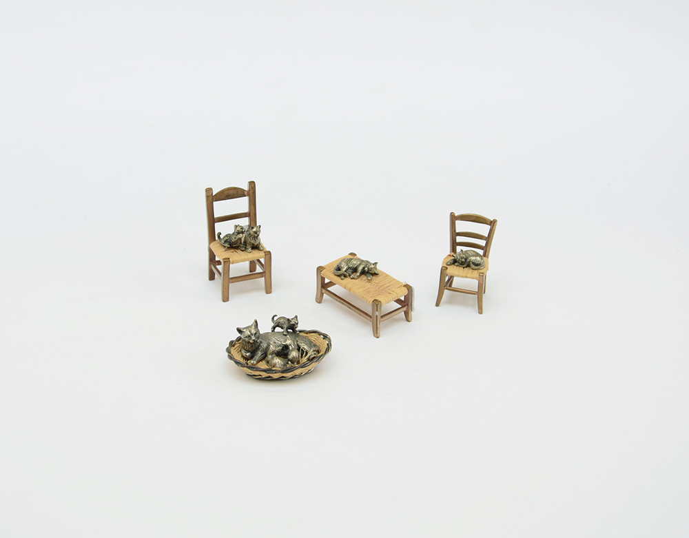 Lotto di quattro oggetti in miniatura raffiguranti due sedie, una panca e una cesta con gattini in varie attivit‡ (lievi difetti)