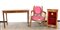 Lotto composto da un comodino in noce con cassetto, un tavolino a due cassetti e una poltrona con imbottiture in skai rosso (gravi difetti e mancanze)