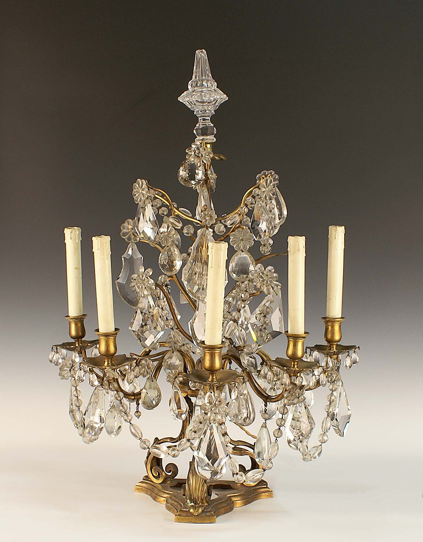 Lampada "Girandoles" a cinque luci in bronzo dorato con gocce ed elementi in vetro, fine del XIX secolo, h. cm. 75 (difetti).