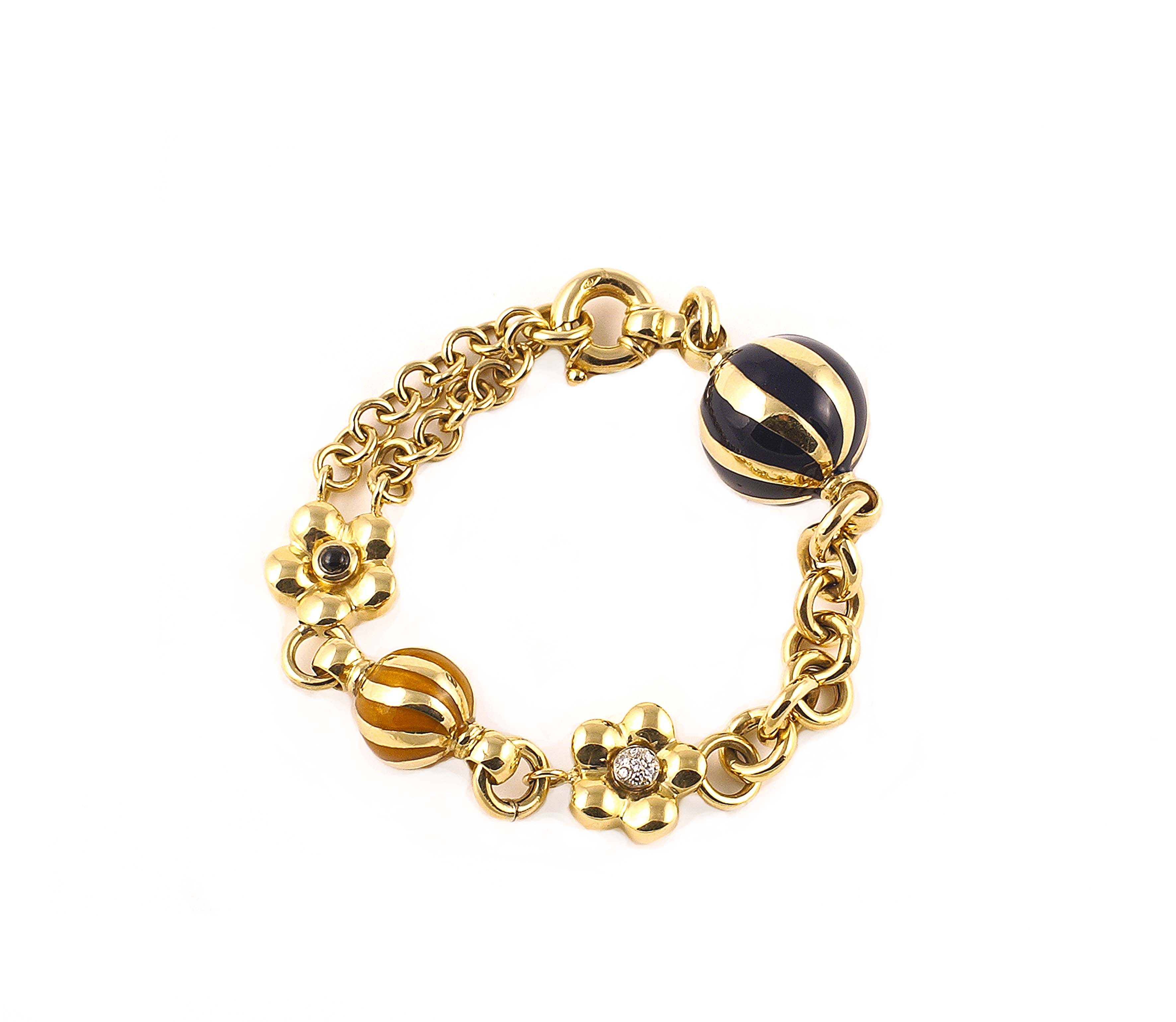 Bracciale in oro 18kt a maglie circolari ed elementi a sfere con stesura di smalto policromo e fiori con incastonati diamanti taglio brillante per 0,15 punti circa e zaffiro cabochon, gr. 37.