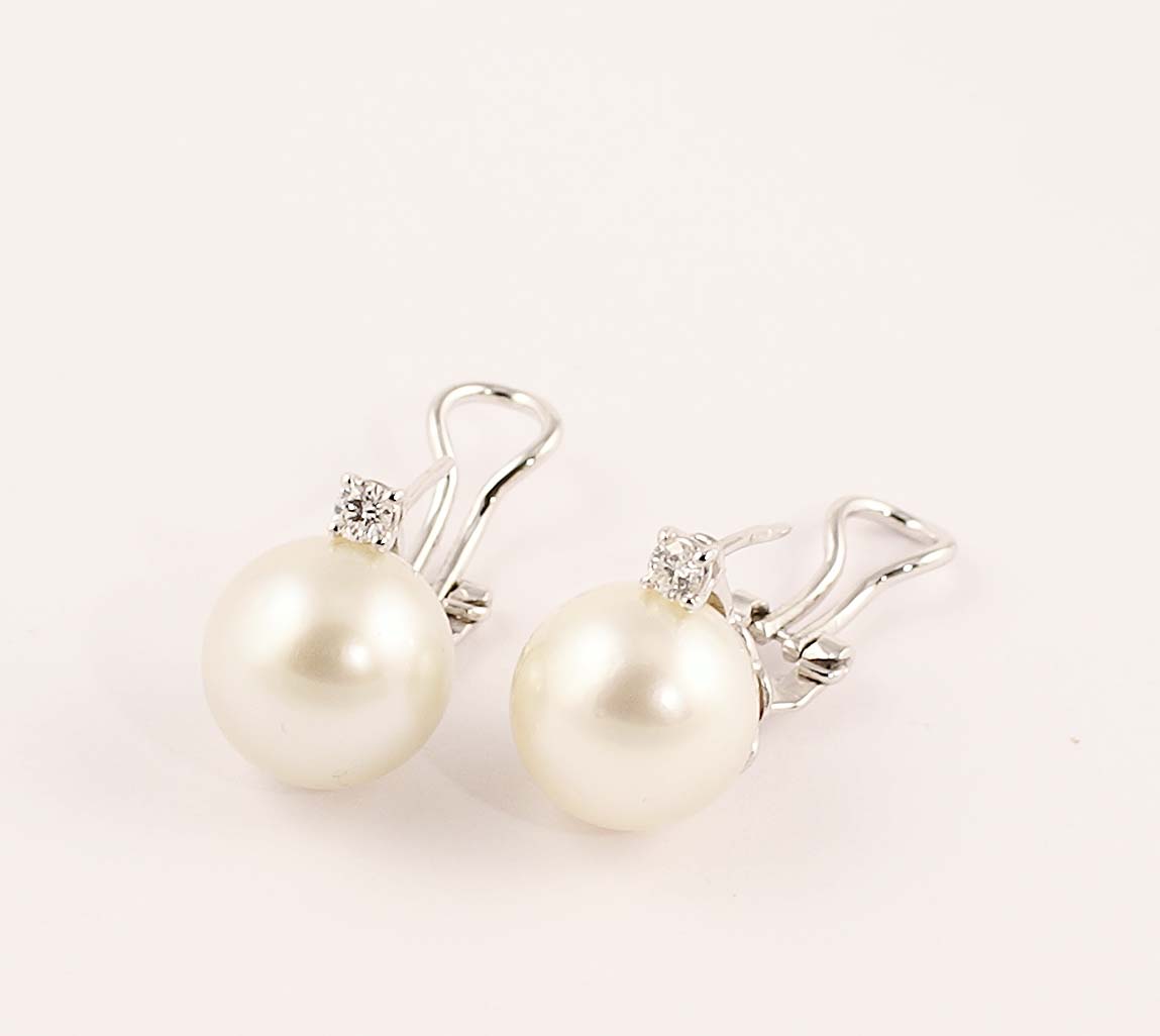 Orecchini a lobo in oro bianco 18kt con incastonate due perle coltivate di mm. 12 circa e due diamanti taglio brillante per 0,90 punti circa, gr. 8,6.