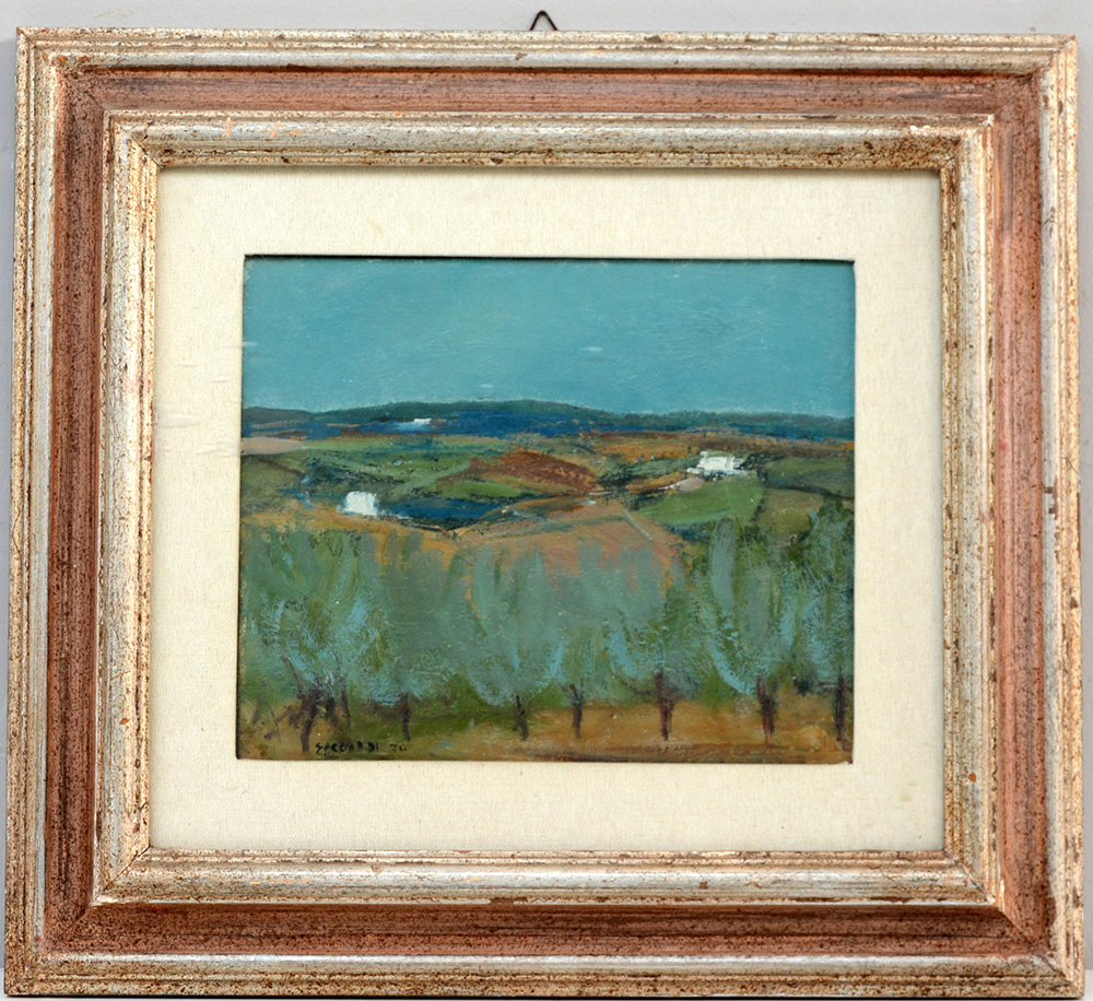 Saccardi Carlo "Paesaggio" 1970, olio su tela (cm 24,5x30), firmato e datato in basso a sinistra. Firmato al retro. In cornice (lievi difetti)