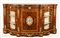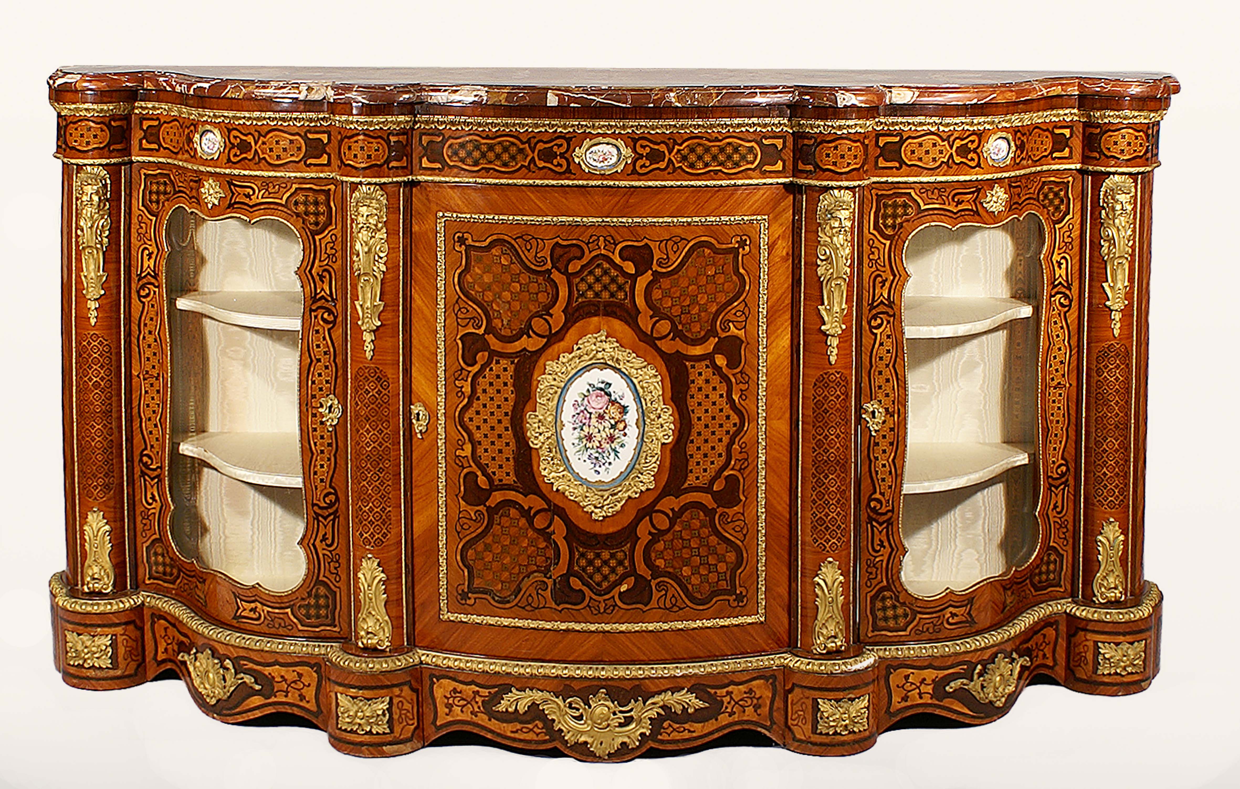 Importante credenza Francia, periodo Napoleone III, di linea mossa in bois de rose, riccamente intarsiata in palissandro e legni vari, con applicazioni in bronzo dorato, piano sagomato in diaspro di Sicilia, fascia a fronte con tre sportelli di cui due laterali a vetrina, decorati da placche in porcellana policroma di forma ovale, cm. 113x214x55.