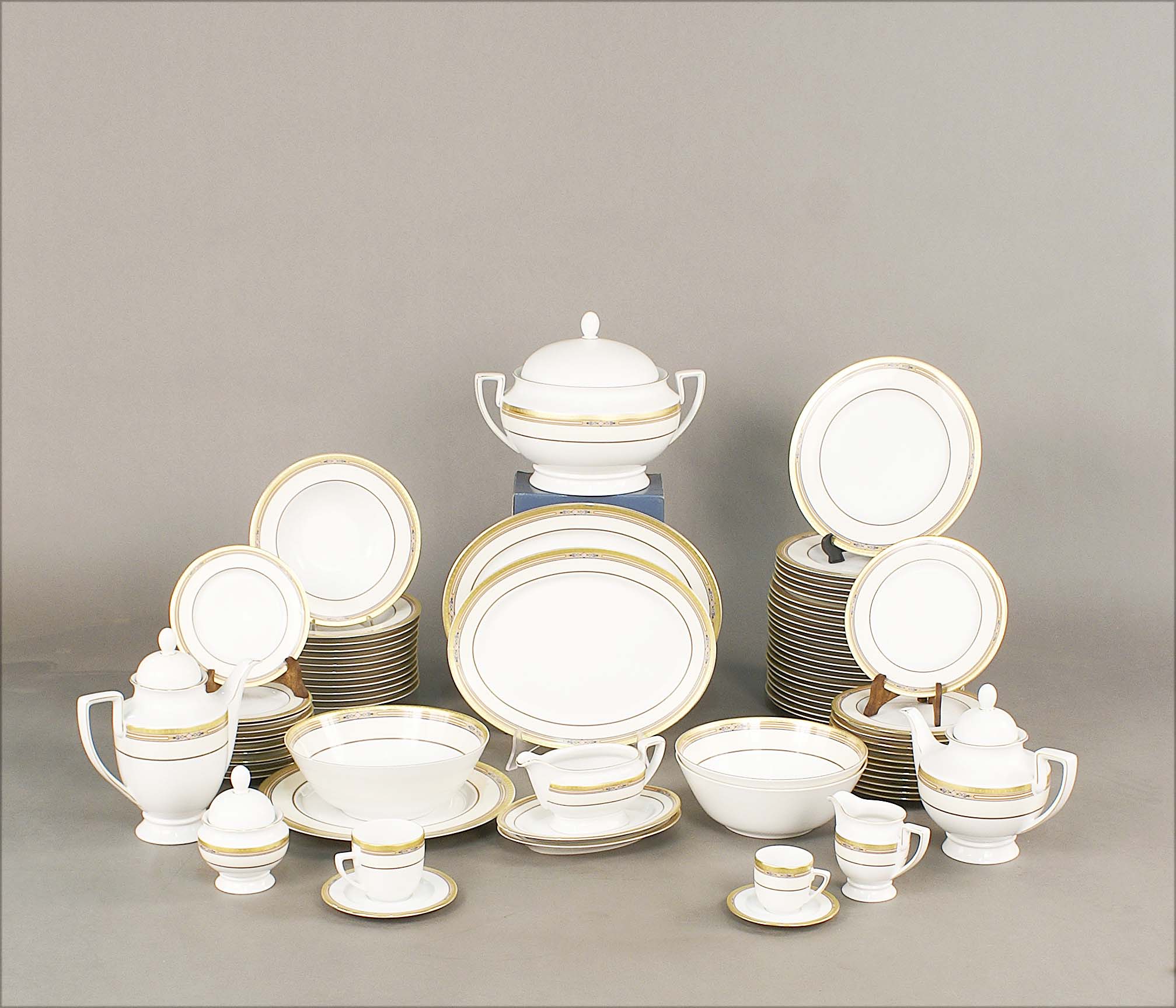 Servizio di piatti in porcellana decorata a policromia con profilo dorato, composto da 24 piani, 12 fondi, 12 frutta, una zuppiera, una salsiera, 9 piatti da portata, un servizio da caffè 23 pezzi e un servizio da the 27 pezzi, manifattura Bavaria.