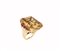 Anello a ponte in oro giallo 18kt con incastonato un grande quarzo citrino taglio smeraldo per carati 50 circa con ai lati otto rubini tondi per 0,40 punti circa, anni 40/50, gr. 24,8.