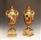 Coppia di vasi Vienna, fine del XIX secolo, in porcellana rosso bordeaux e oro, il corpo è decorato sul fronte e sul retro da scene tratte dall'antico entro riserve rettangolari, circondate da ricchi fregi e volute, anse a motivo di foglie d'acanto, poggianti su basi a plinto in porcellana e decorate a motivi mitologici. Recano alla base il marchio blu della manifattura, h. cm. 52.