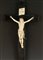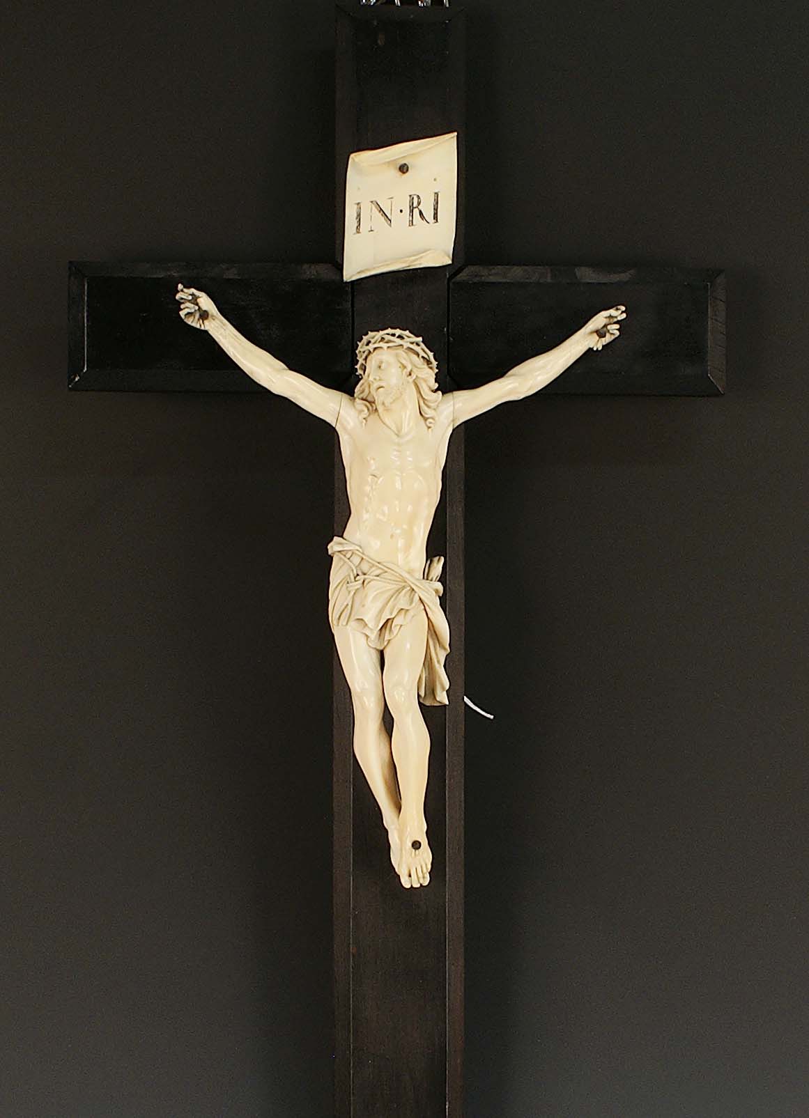 Cristo in avorio finemente scolpito, poggiante su croce in legno ebanizzato,...