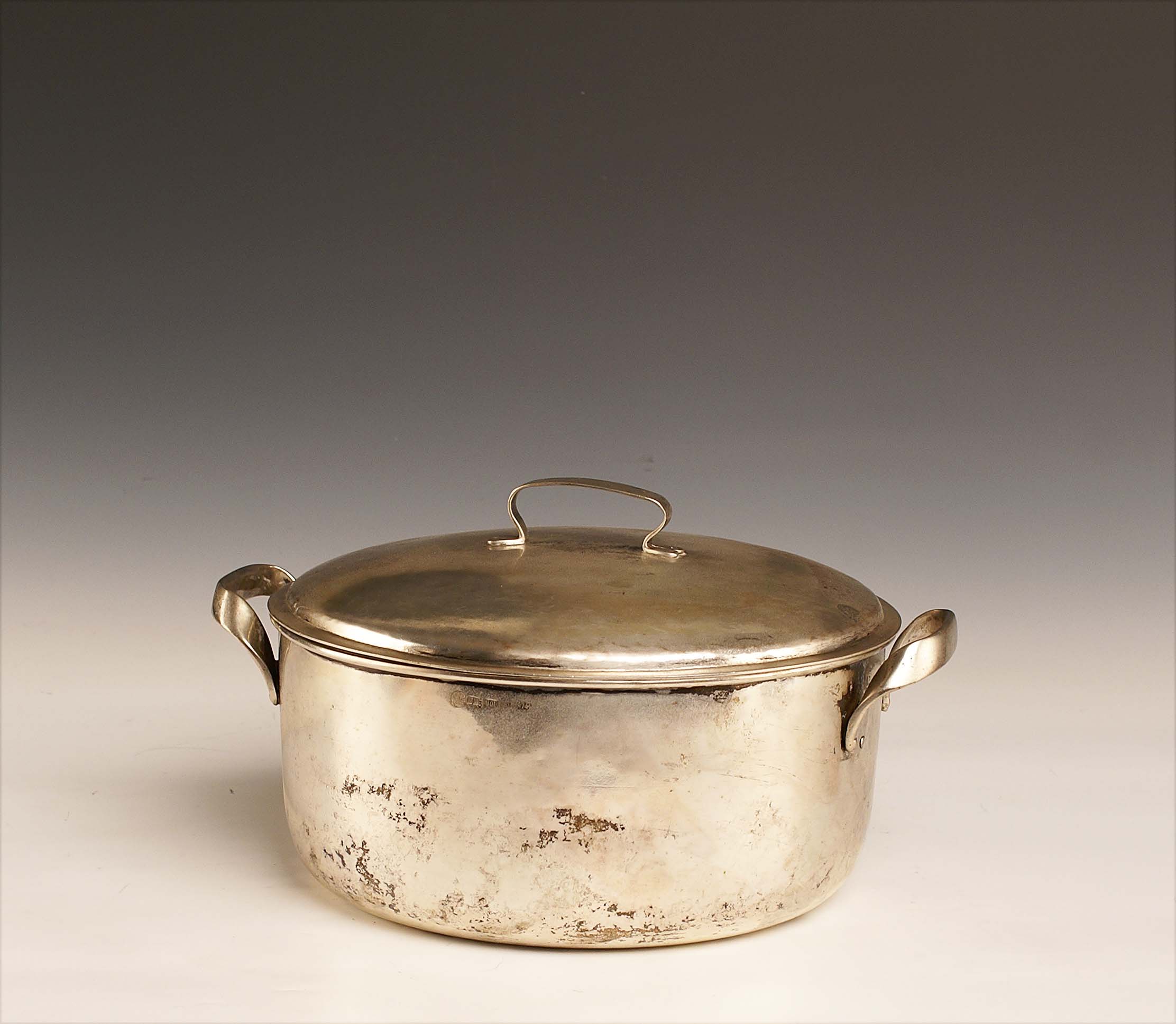 Pentola in argento con due manici e relativo coperchio a corpo liscio, Firenze 1974, orafo Brandimarte, gr. 1350, h. cm. 12, d. cm. 25.