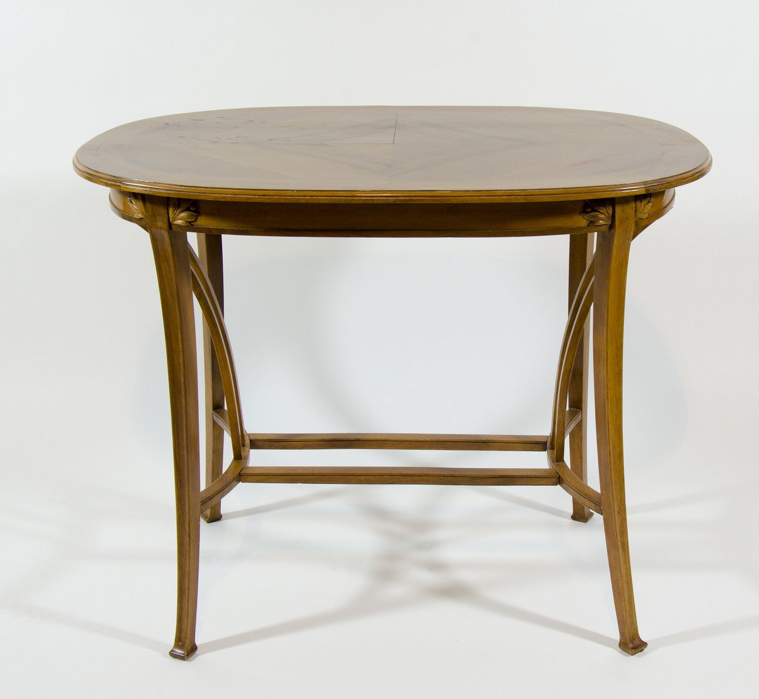Tavolo ovale in legno chiaro su gambe mosse. Epoca Liberty.