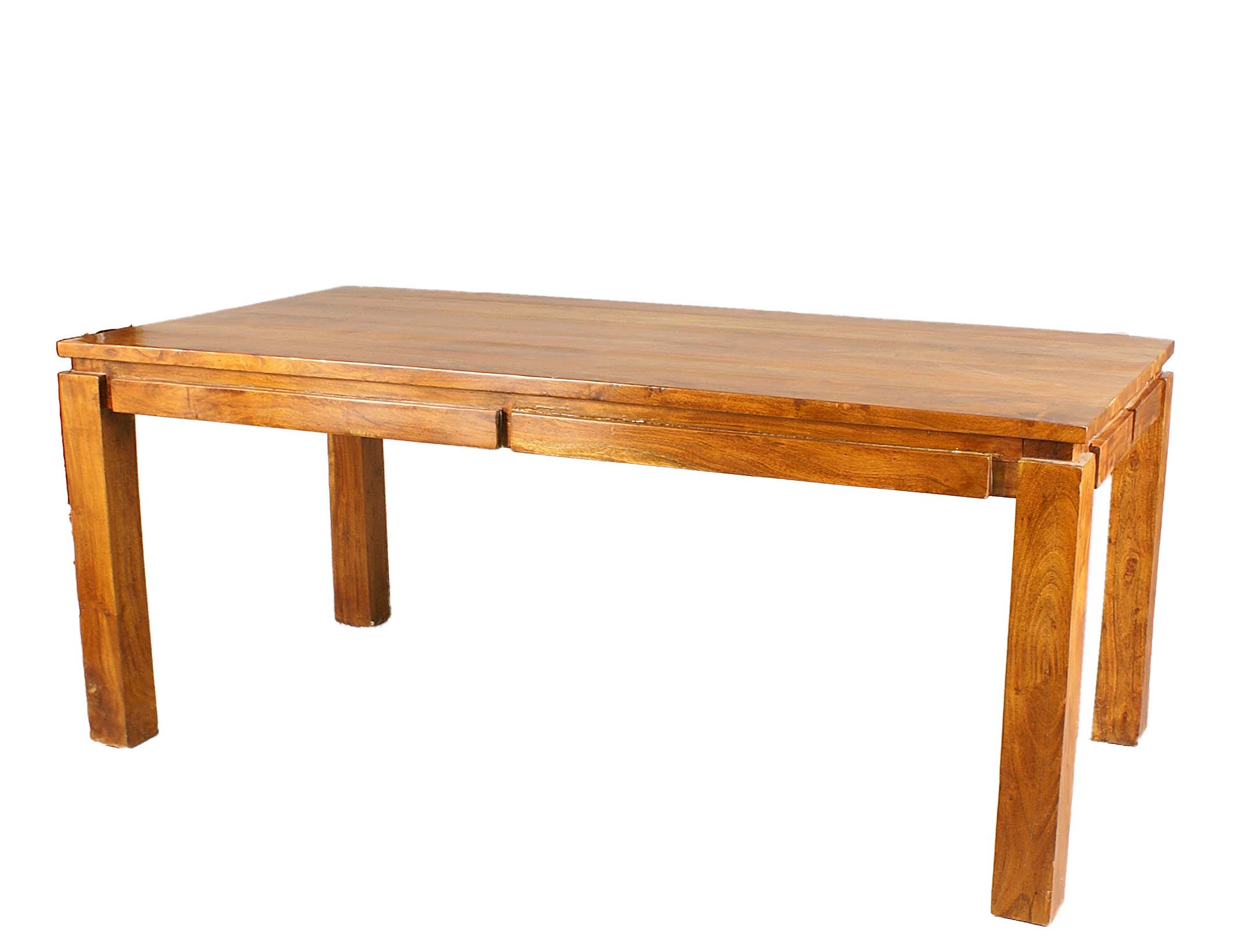 Tavolo etnico allungabile in iroko, piano rettangolare con fascia sottostante poggiante su quattro gambe di linea squadrata completo di due prolunghe di cm. 40 cadauna, cm. 76x180x91 (chiuso), cm. 76x260x91 (aperto).