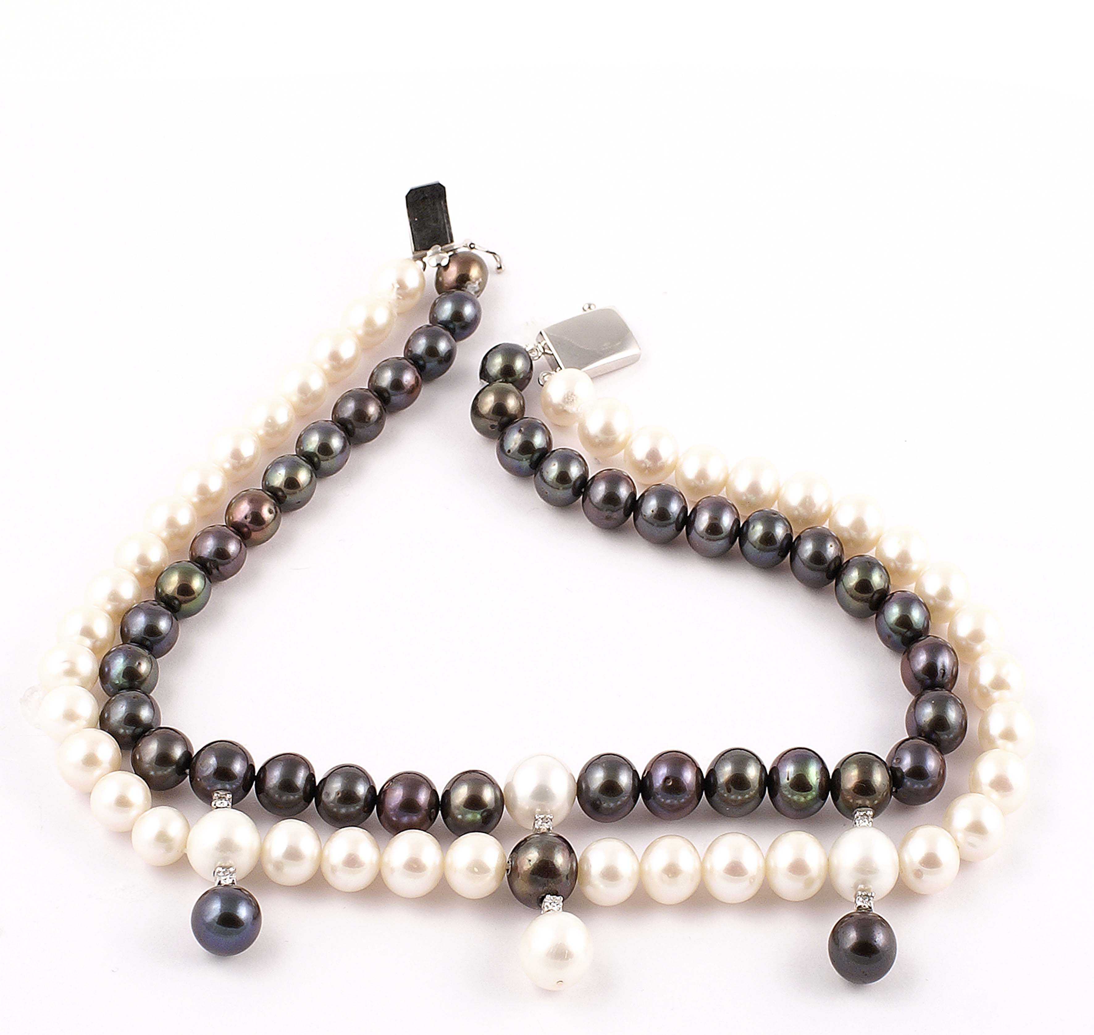 Collarino composto da due fili di perle coltivate rispettivamente bianche e tahiti di mm. 9 e 10, alternate da quattro diamanti taglio brillante per 0,20 punti circa, chiusura in oro bianco 18kt, gr. 89,8.
