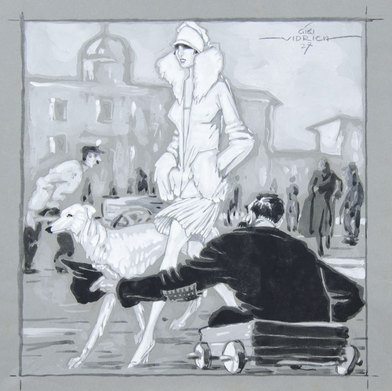 Luigi Vidris detto Vidrich Pola 1897-Torino 1976 "A passeggio" cm. 33x33 - acquerello su carta Firmato alto a d. e datato '27.
