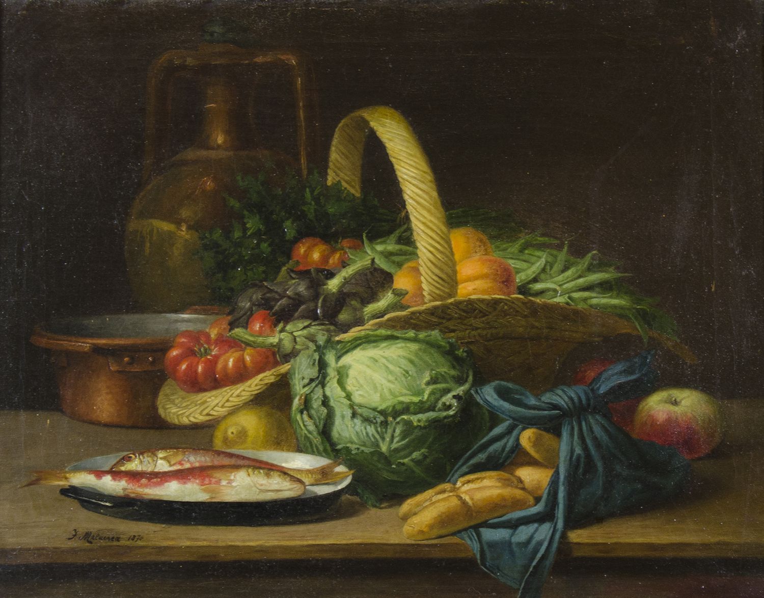 Francesco Malacrea Trieste 1813-1886 "Natura morta con pesci" cm. 37x47 - olio su tela Firmato b. a s. e datato 1870.