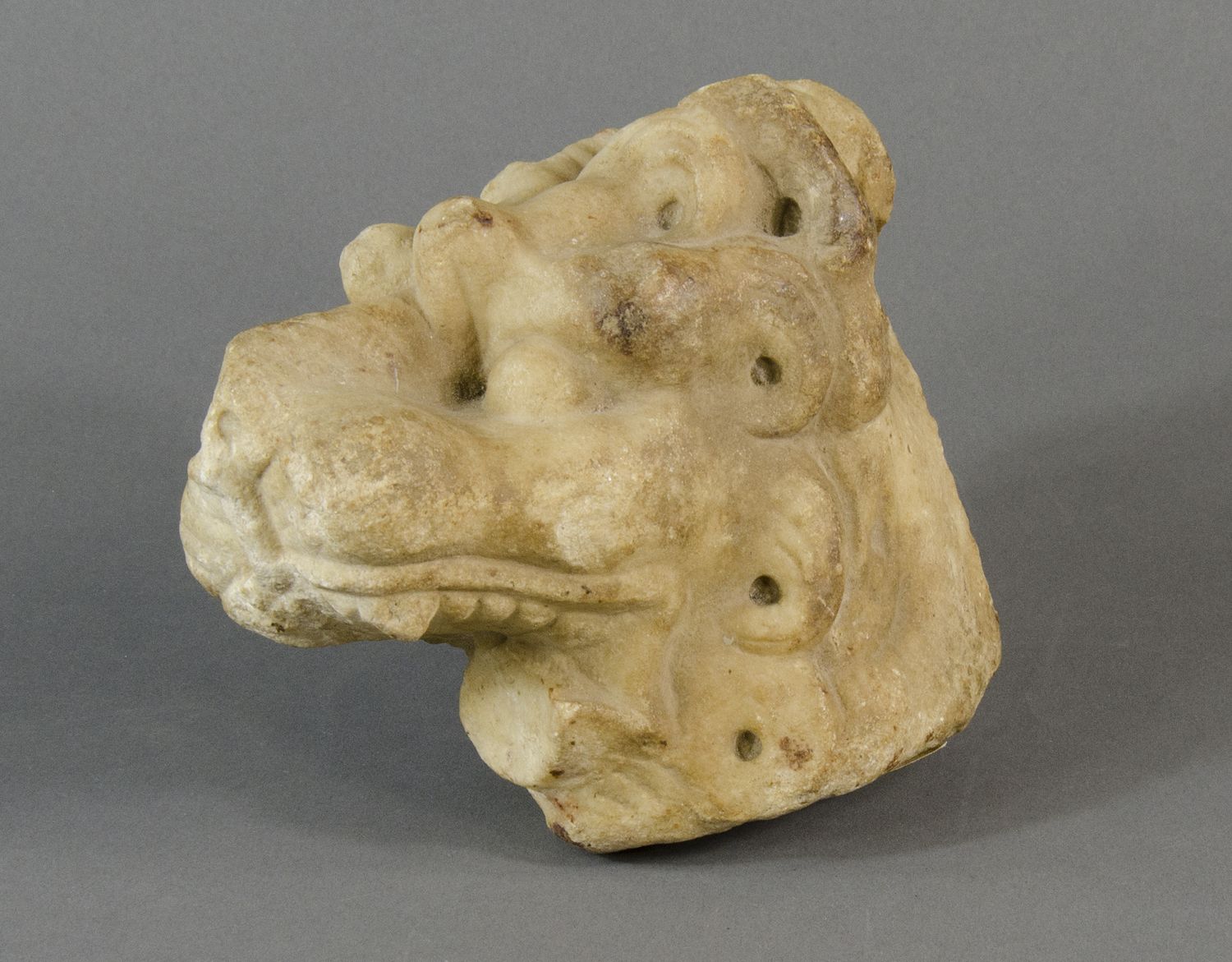 Scultura in pietra scolpita raffigurante testa di leone, su base in velluto. XVII secolo. H. cm. 13.