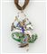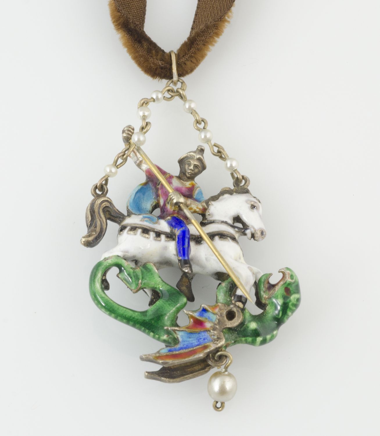 Pendente in oro, argento e smalti policromi raffigurante guerriero a cavallo.