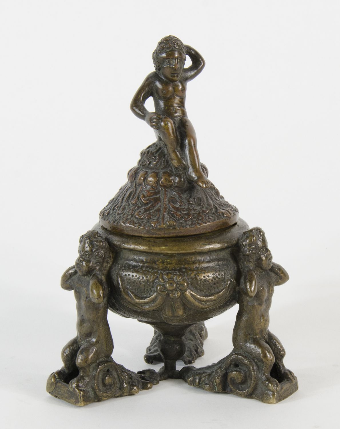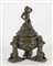 Calamaio in bronzo a patina marrone decorato con figure di putti. XIX secolo. H. cm. 17,5.