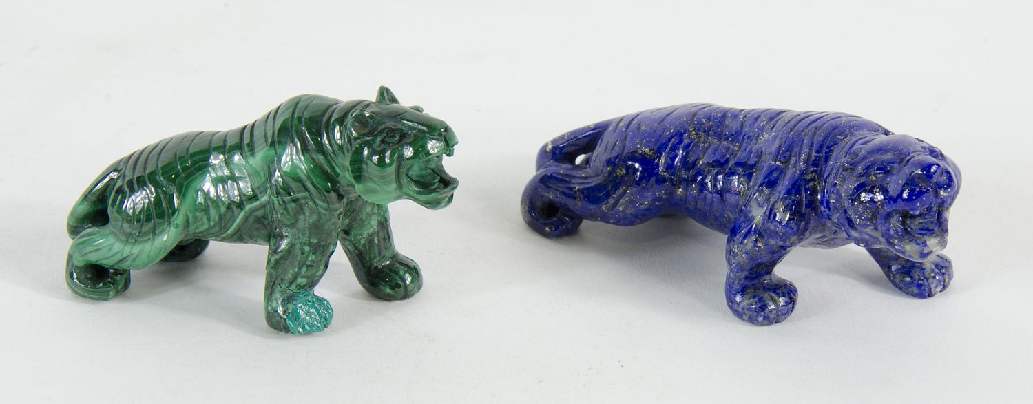 Lotto di 2 animaletti in lapislazzulo e malachite. Entro astucci originali.