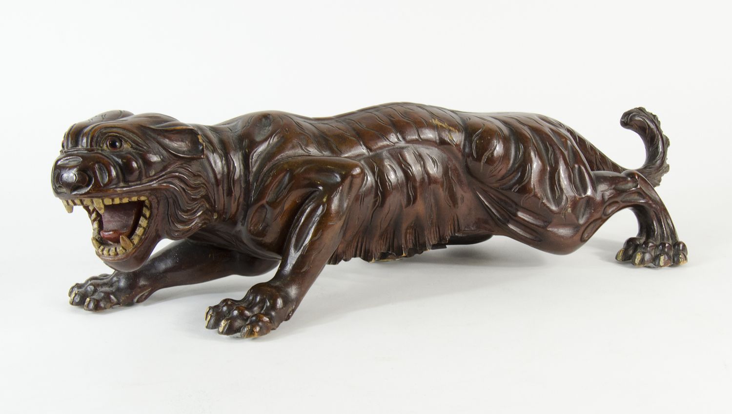 Scultura in legno scolpito raffigurante leone. XIX secolol. Lung. cm. 64.