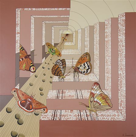 Adriano Janezic "Composizione con farfalle" cm. 100x100 - olio su tela Firmato b. a d. e datato '82.