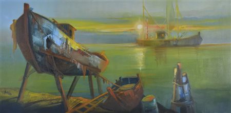 Ottavio Bomben 1925-2006 "Laguna" cm. 60x120 - olio su tela Firmato b. a d. Al retro firma, data 1990 e dedica.