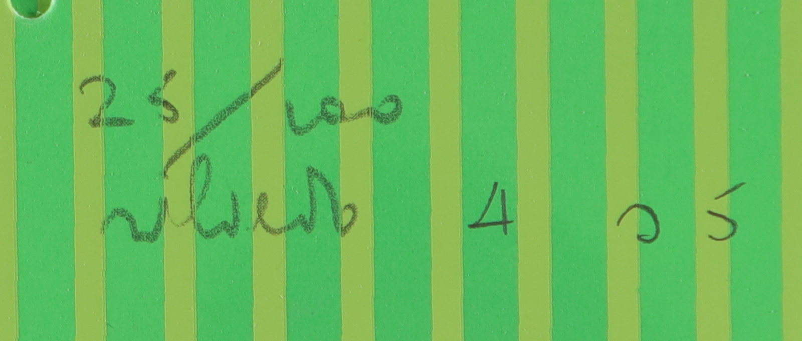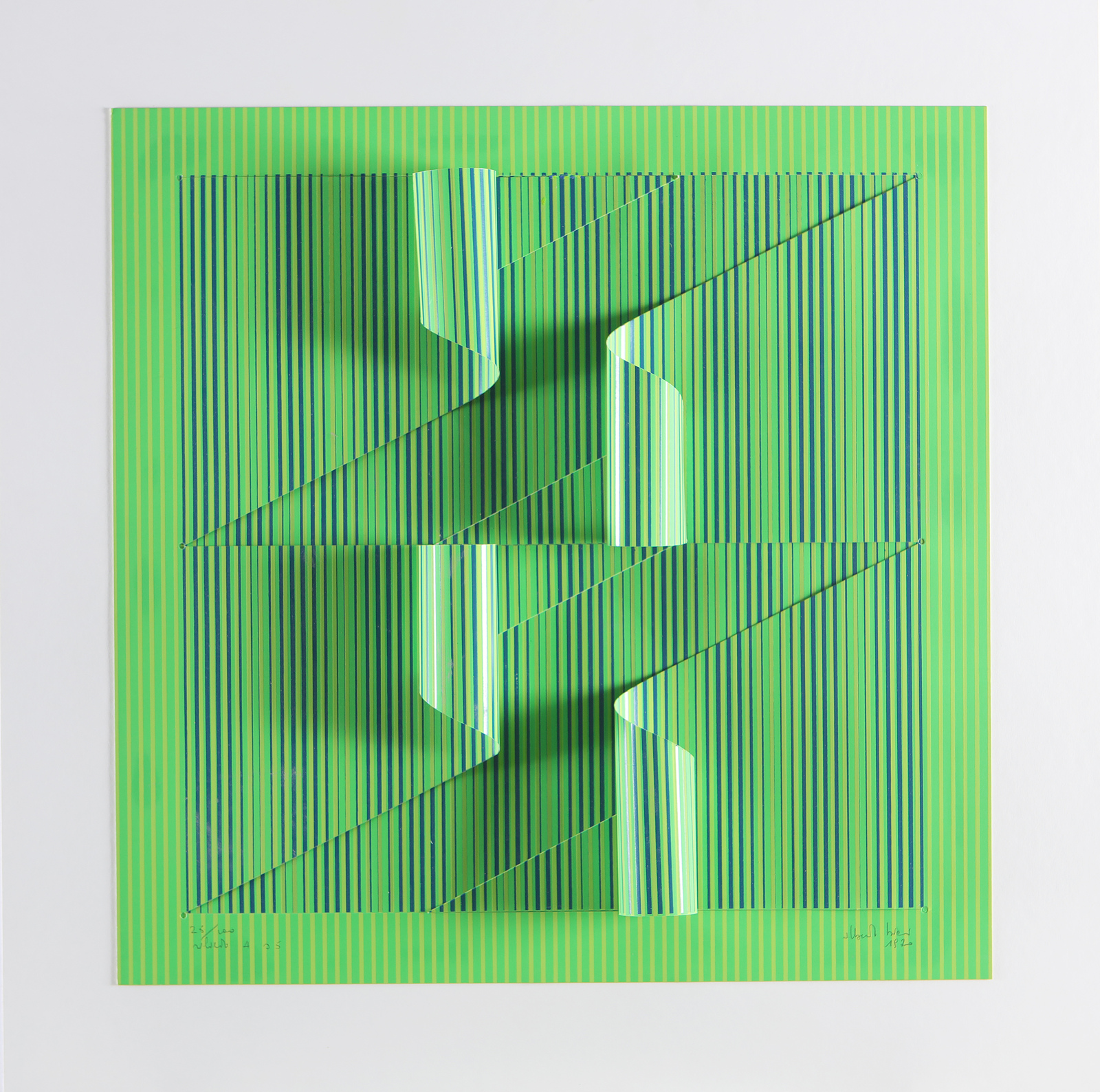 BIASI ALBERTO (n. 1937) Rilievo 4. 1970. Serigrafia su carta fustellata. Cm 48,00 x 48,00. 25/100. Tiratura, titolo, firma e anno a matita in basso. Grafica proveniente da una cartella contenente cinque serigrafie originali a colori, di cui tre su supporto doppio e una a rilievo, sono stati tirati cento esemplari numerati da 1 a 100 e dieci fuori commercio numerati da I a XI. Tutte le serigrafie sono firmate dall'artista. Opera contenuta in una teca di plexiglass. Cornice presente