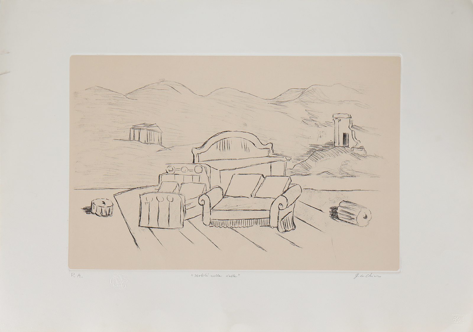 DE CHIRICO GIORGIO (1888 - 1978) Furniture in the valley. 1971. Lithograph. Cm 70,00 x 50,00. P.A. Edition, title and signature lower in pencil. Dry stamp G. De Chirico. Dry stamp Alberto Caprini Printer, Rome. Plate size: 32.5 x48.5 cm.