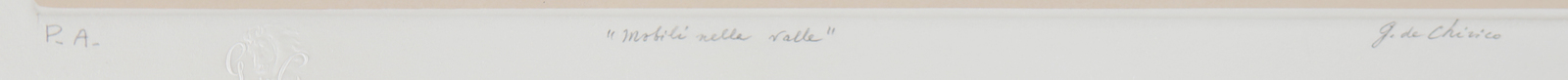 DE CHIRICO GIORGIO (1888 - 1978) Mobili nella valle. 1971. Litografia. Cm 70,00 x 50,00. P.A. Tiratura, firma e titolo a matita in basso. Timbro a secco G.De Chirico in basso a sinistra. Timbro a secco a cura di stampatore Alberto Caprini , Roma. Dimensione lastra: 32.5 x48.5 cm.