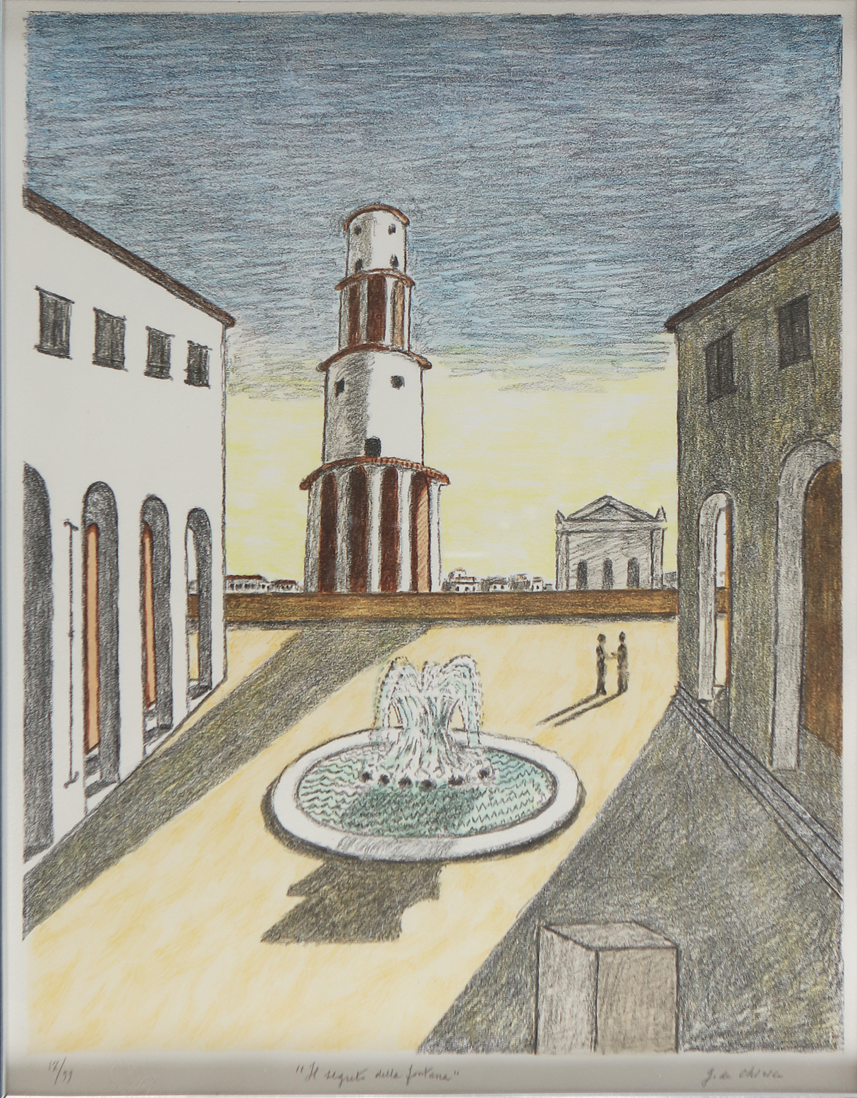 DE CHIRICO GIORGIO (1888 - 1978) The secret of the fountain. 1971. Lithograph. Cm 53,00 x 70,00. 17/99. Edition, title and signature lower in pencil. Dry stamp Giorgio De Chirico lower left. At the back descriptive label: Plus Art, Gallery of Modern Art. Publications: Giorgio De Chirico, Catalog Graphic Work 1969 - 1977. Editions Bora, p 155. In Art - Bimonthly of criticism and visual arts information, number 111, October / November 2007, p 93. Cornice presente