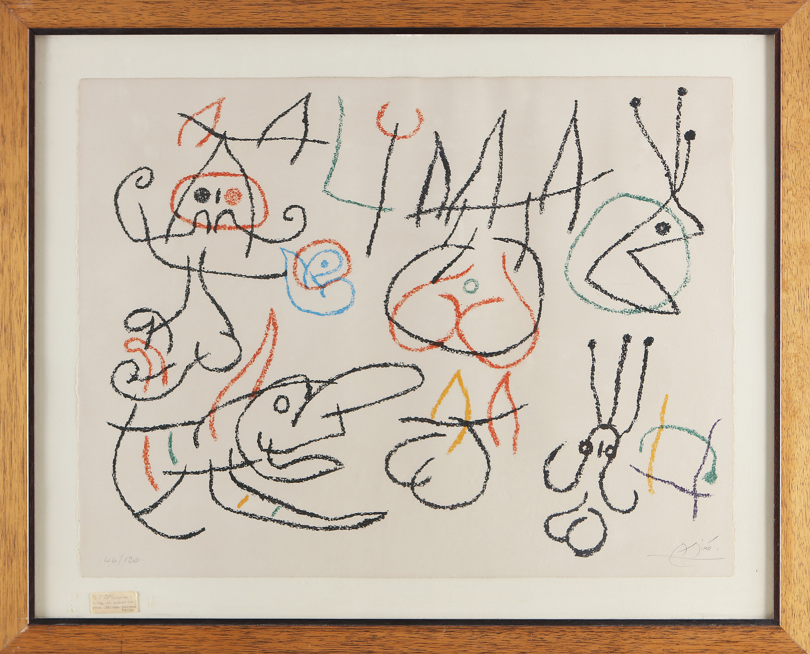 MIRO' JOAN (1893 - 1983) Ubu aux baleares, tavola 10. 1971. Litografia. Cm 66,00 x 50,00. Edizione 120 + 6HC. Esemplare: 46. Tiratura e firma in basso a matita. Filigrana Arches. Bibliografia: Mourlot 766. Editore Teriade, Parigi. Cornice presente