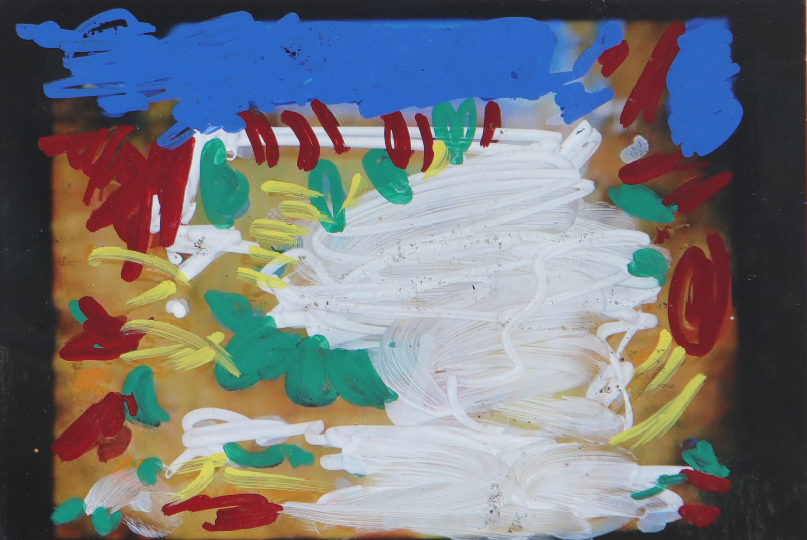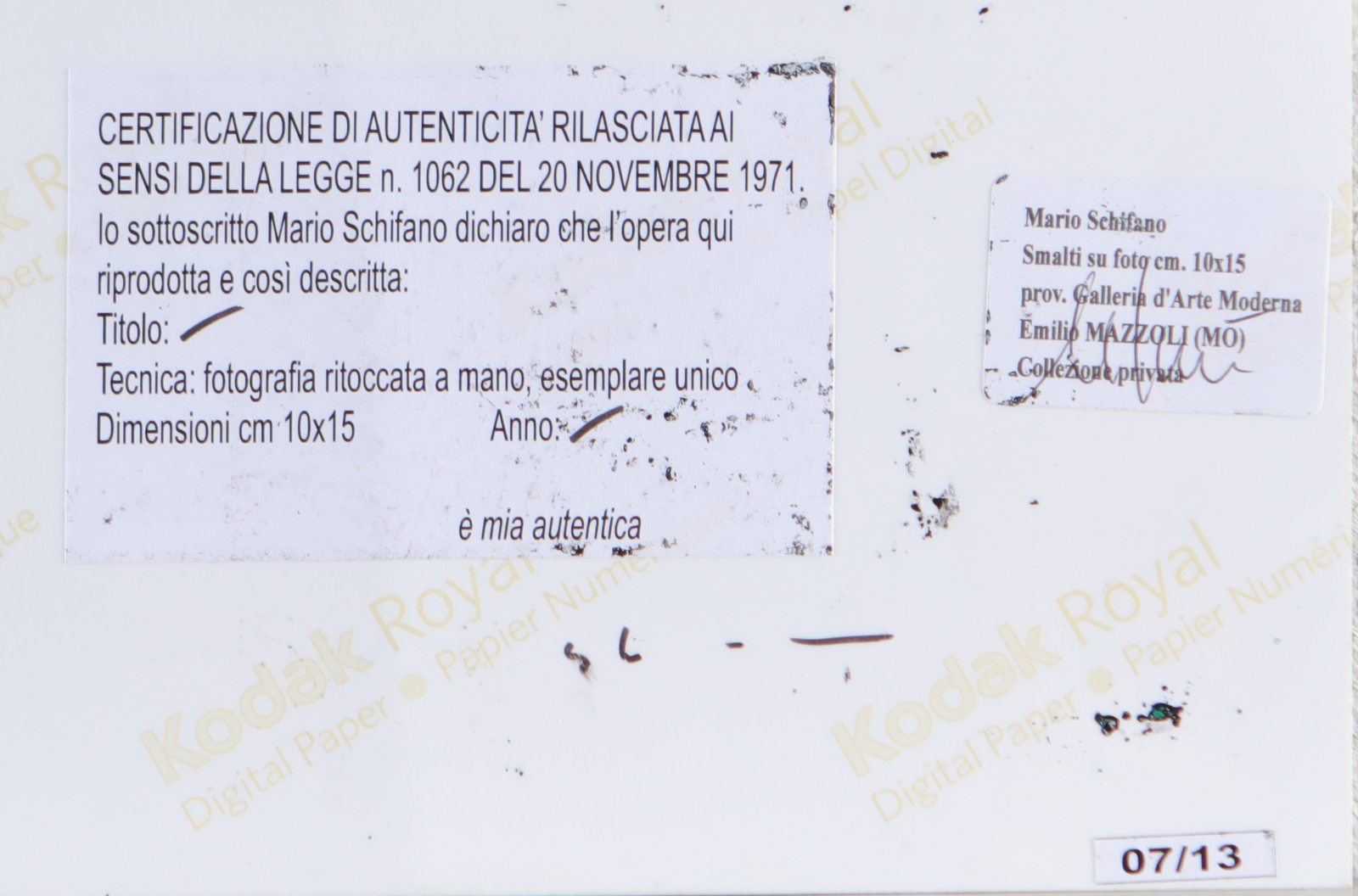 SCHIFANO MARIO (1934 - 1998) Untitled. Mixed media on photograph. Cm 15,00 x 10,00. Signature and Emilio Mazzoli Gallery, Modena, label at the back.. Cornice presente