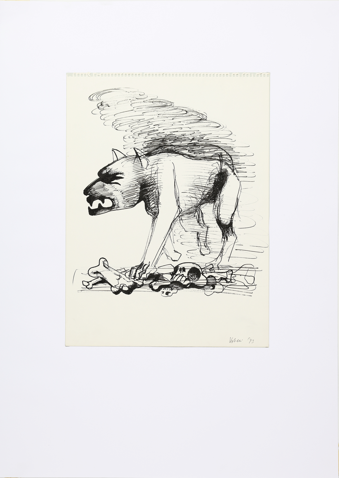 VAGLIERI TINO (1929 - 2000) Dog with skull and bones. 1973. Mixed media on paper. Cm 30,00 x 40,00. Signature and year lower right in pencil