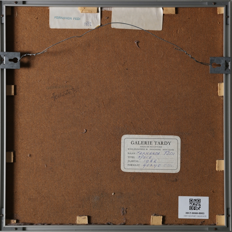 FEDI FERNANDA (n. 1940) Species as. 1982. Mixed media on cardboard. Cm 40,00 x 40,00. At the back descriptive label by the Galerie Tardy, Enschede. Cornice presente