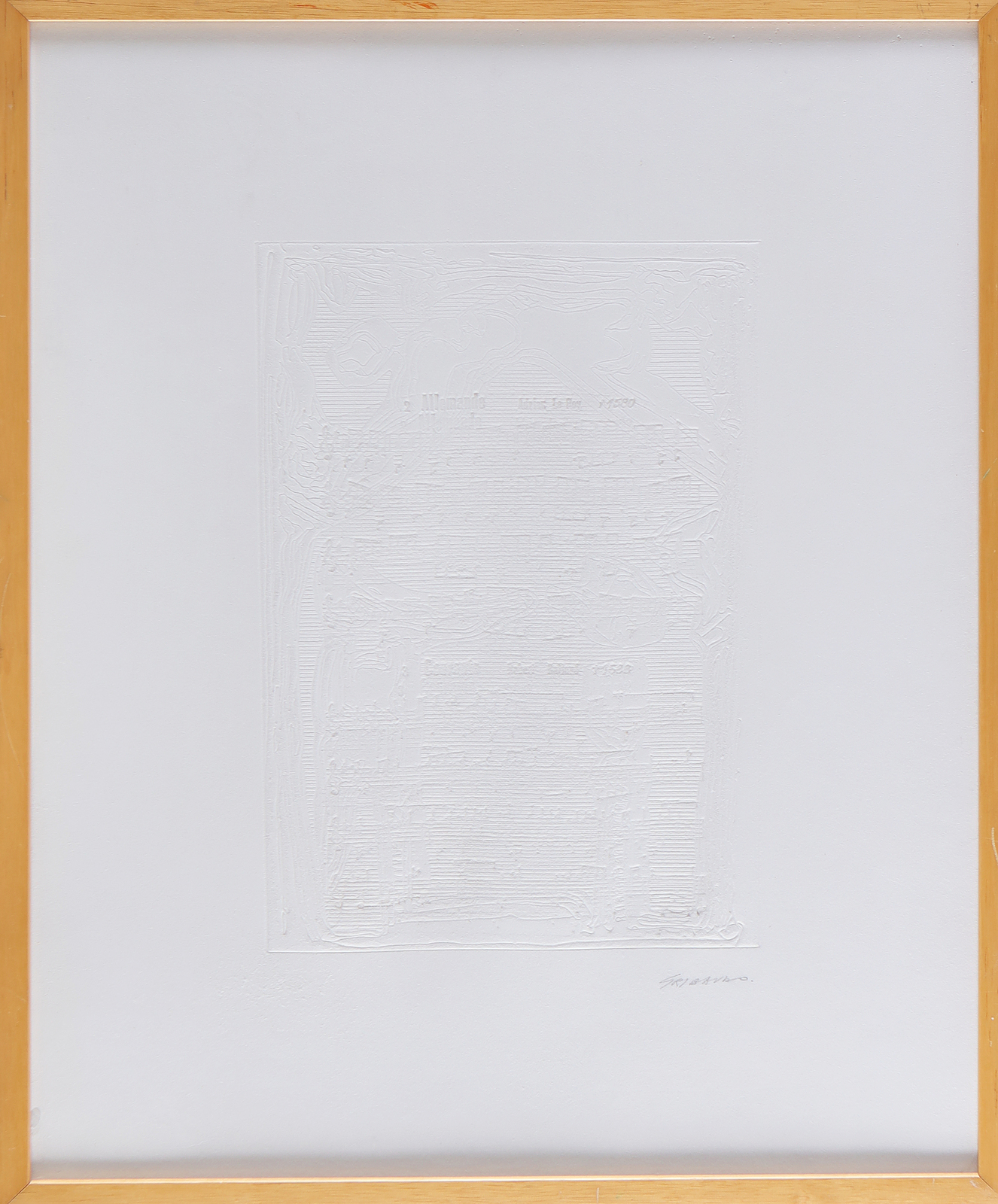 GRIBAUDO EZIO (n. 1929) Logogrifo. Relief on bouvard paper. Cm 43,50 x 55,00. Signed lower right. Artist's label at the back. Cornice presente