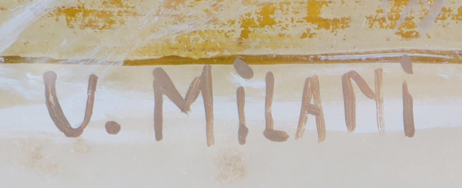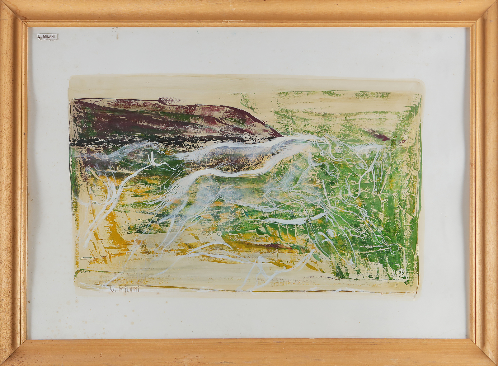 MILANI UMBERTO (1912 - 1969) Senza titolo. Tecnica mista su cartoncino. Cm 100,00 x 70,00. Firma in basso a sinistra. Al retro firma. Cornice presente