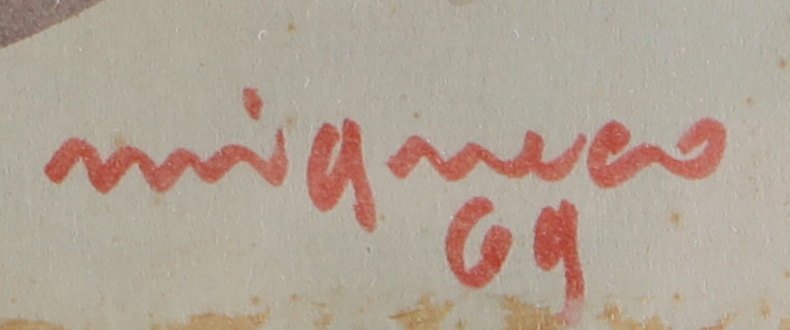 MIGNECO GIUSEPPE (1908 - 1997) Senza titolo. 1969. Acquerello su carta applicata su tela. Cm 22,00 x 28,00. Firma ed anno in basso a destra. Cornice presente