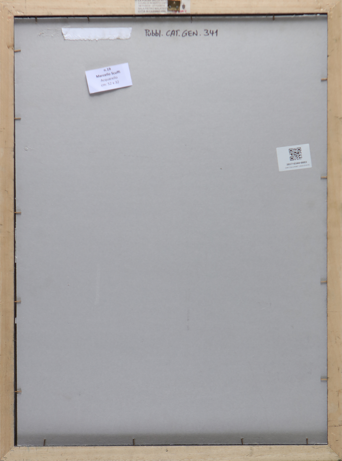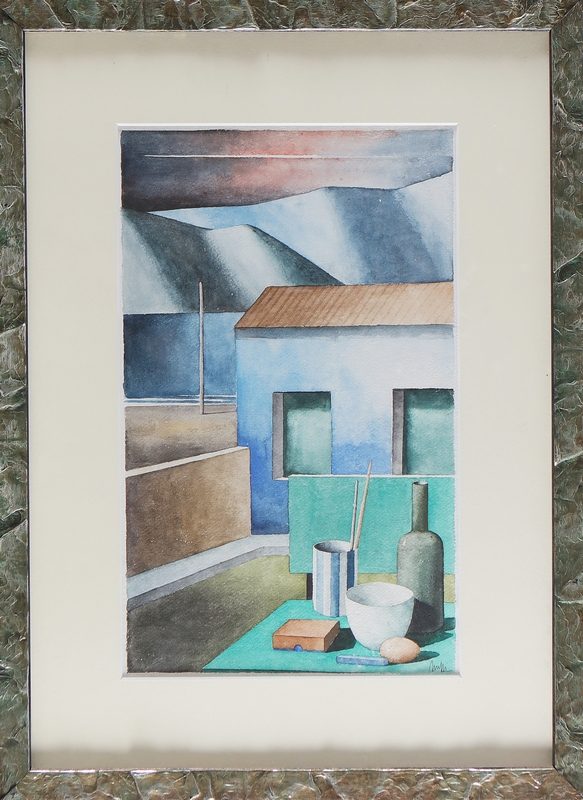 SCUFFI MARCELLO (n. 1948) Natura morta con paesaggio. 2014. Acquarello su cartone. Cm 31,50 x 54,00. Firma in basso a destra. Opera archiviata presso l'Archivio Marcello Scuffi, come documentazione fotografica allegata all'opera riportante il relativo numero di inventario. . Cornice presente
