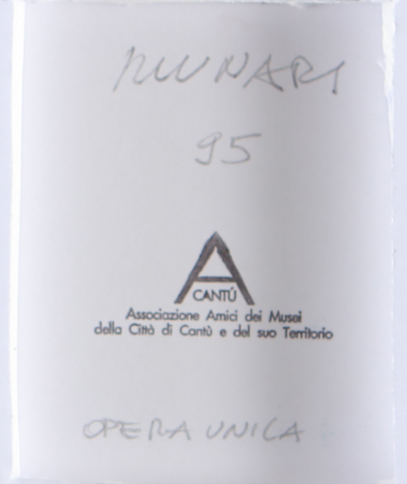 MUNARI BRUNO (1907 - 1998) Negative-positive. 1995. . Cm 50,00 x 50,00. At the back: signature, year and the stamp of the Associazione Amici dei Musei della città di Cantù e del suo territorio. Publication: by Luca Beatrice, Bruno Munari positive negative and other small and big stories, from 28/10/2016 to 12/18/2016, at the gallery Res Publica, the Democratic Art Gallery, Venaria Reale, Turin. Cornice presente