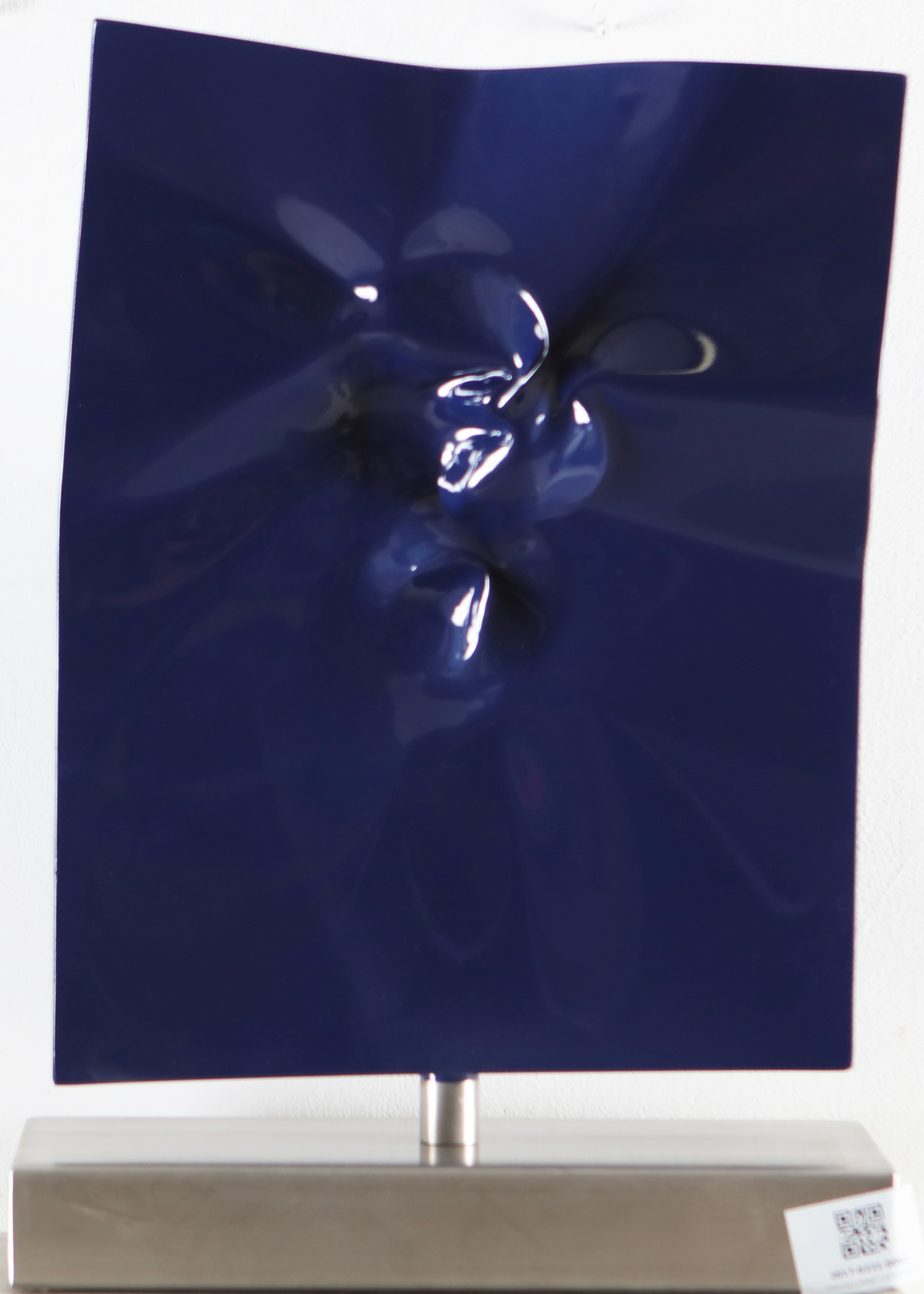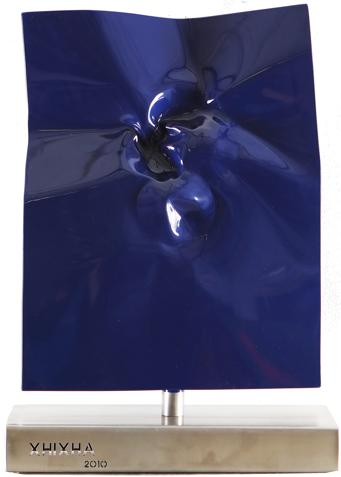 XHIXHA HELIDON (n. 1970) Big Bang. 2010. Alluminio laccato. Cm 37,00 x 50,00 x 15,00. Scultura in ferro laccato blu. Firma e anno incisi alla base. Opera archiviata presso Swiss ArtData, Lugano. Autentica dell'artista su fotografia. Dimensioni senza base: 42.5 x 32 x 5 cm.