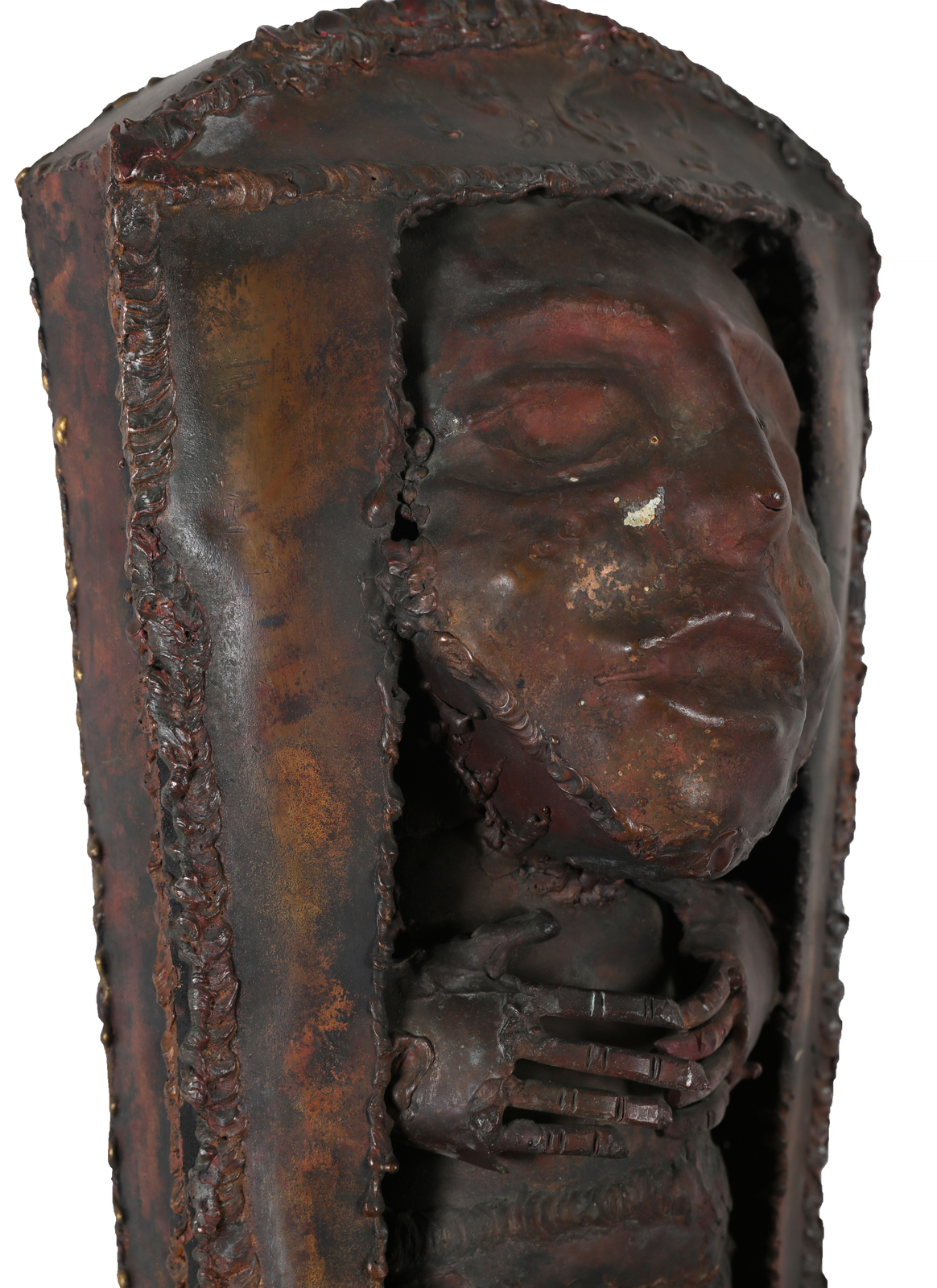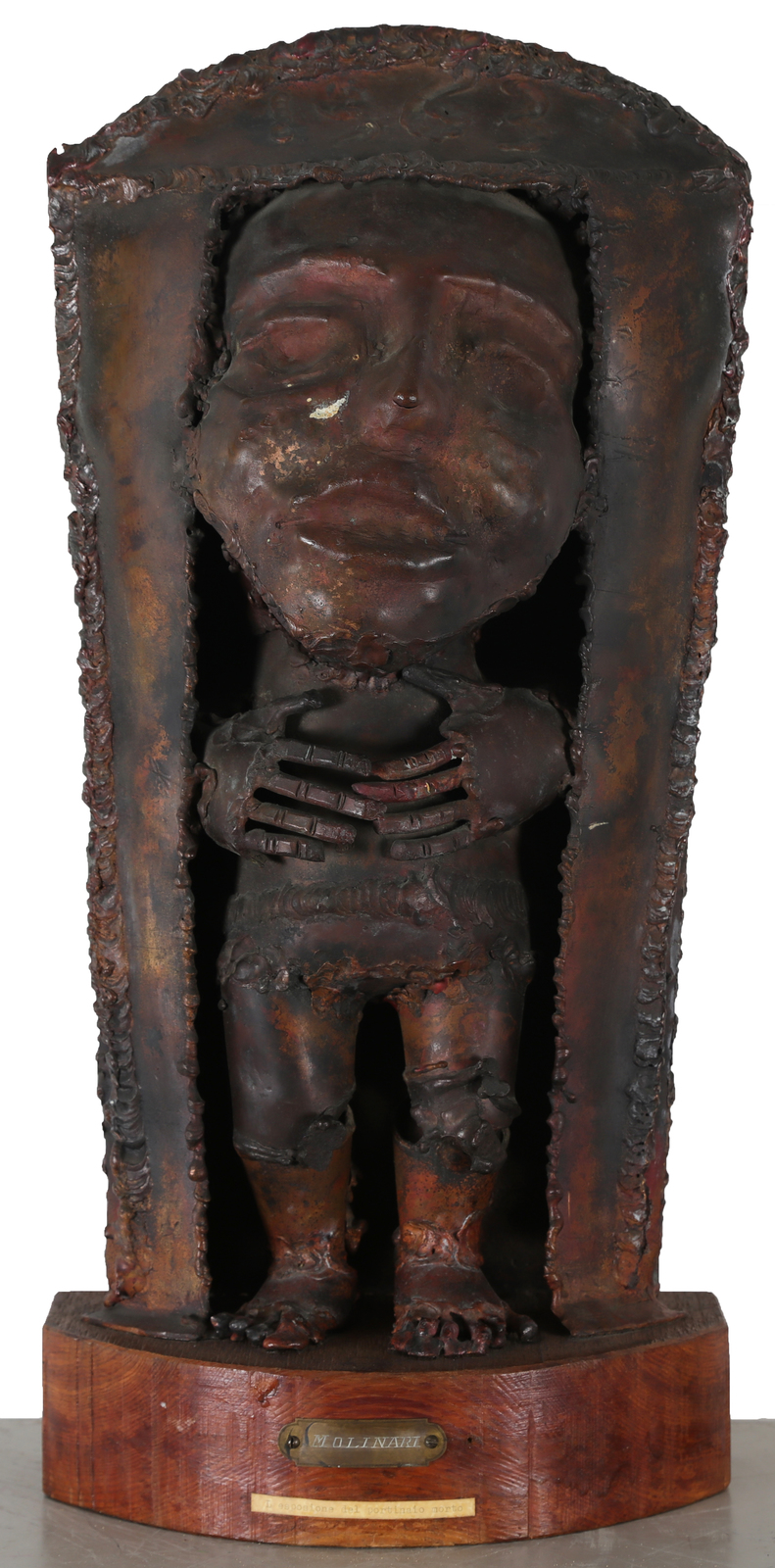 MOLINARI MARIO (1930 - 2001) The explosion of the dead janitor. 1966. Copper. Cm 29,00 x 55,00 x 16,00. Signature and year upper. At the back: Il Fauno Gally, Turin. label; Tardy Gallery, Enschede, label.
