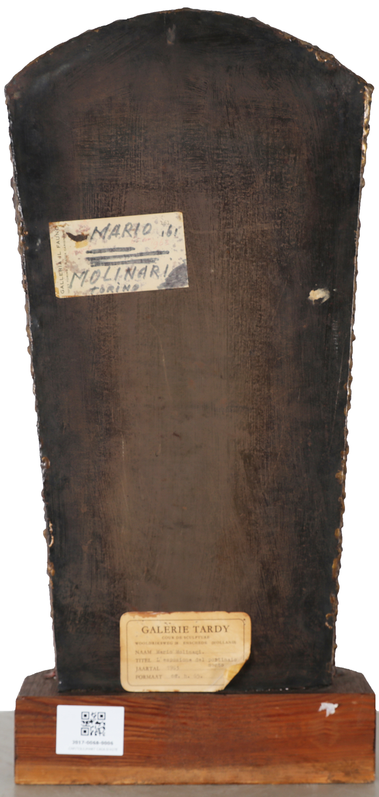 MOLINARI MARIO (1930 - 2001) L'esplosione del portinaio morto. . 1966. Rame. Cm 29,00 x 55,00 x 16,00. In alto firma e anno. Al retro cartiglio a cura della Galleria Il Fauno, Torino. Cartiglio descrittivo a cura della Galleria Tardy, Enschede.