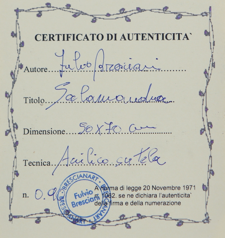 BRESCIANI FULVIO (n. 1968) Salamandra rossa. Acrilico su tela. Cm 70,00 x 50,00. Firma in basso a destra. Al retro certificato di autenticità a cura dell'artista.