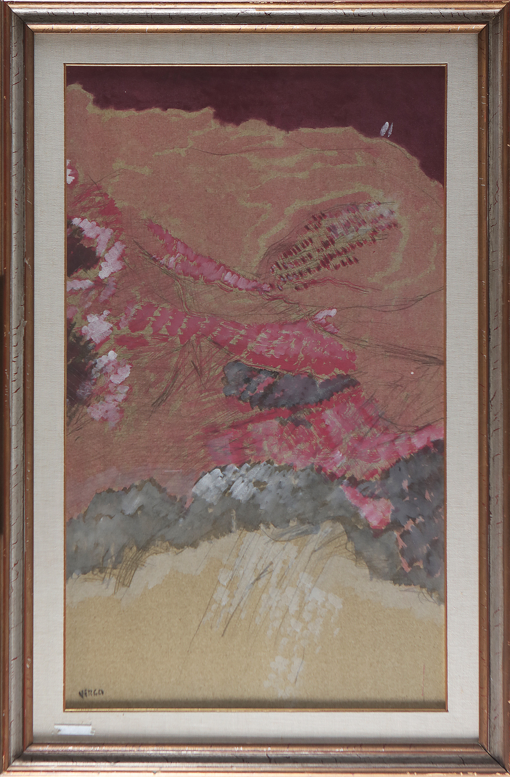 VERGA PIERANTONIO (n. 1947) Senza titolo. Tecnica mista su tela. Cm 60,00 x 100,00. Firma in basso a sinistra. Presenta un piccolo foro lungo il lato sinistro. Cornice presente