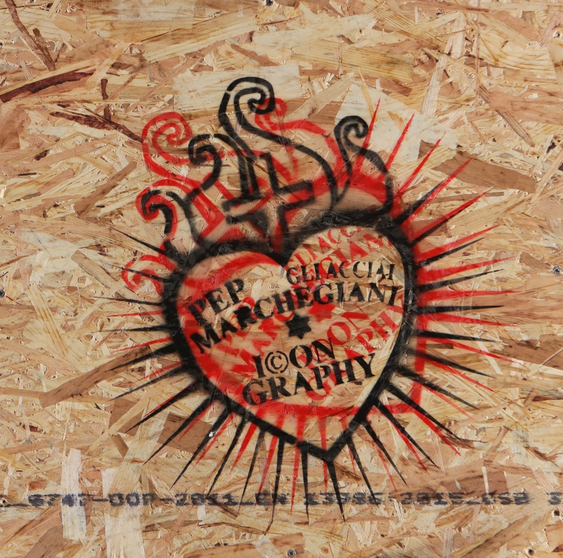 MARCHEGIANI PEP (n. 1971) Kiss me Lello. 2016. Serigrafia su lastra di acciaio. Cm 50,00 x 50,00 x 2,00. Al retro titolo, firma e anno. Adesivo con istruzioni. Autentica dell'artista su fotografia riportante il relativo numero di inventario. Pubblicazione, Pep Marchegiani, Iconography, 2017.