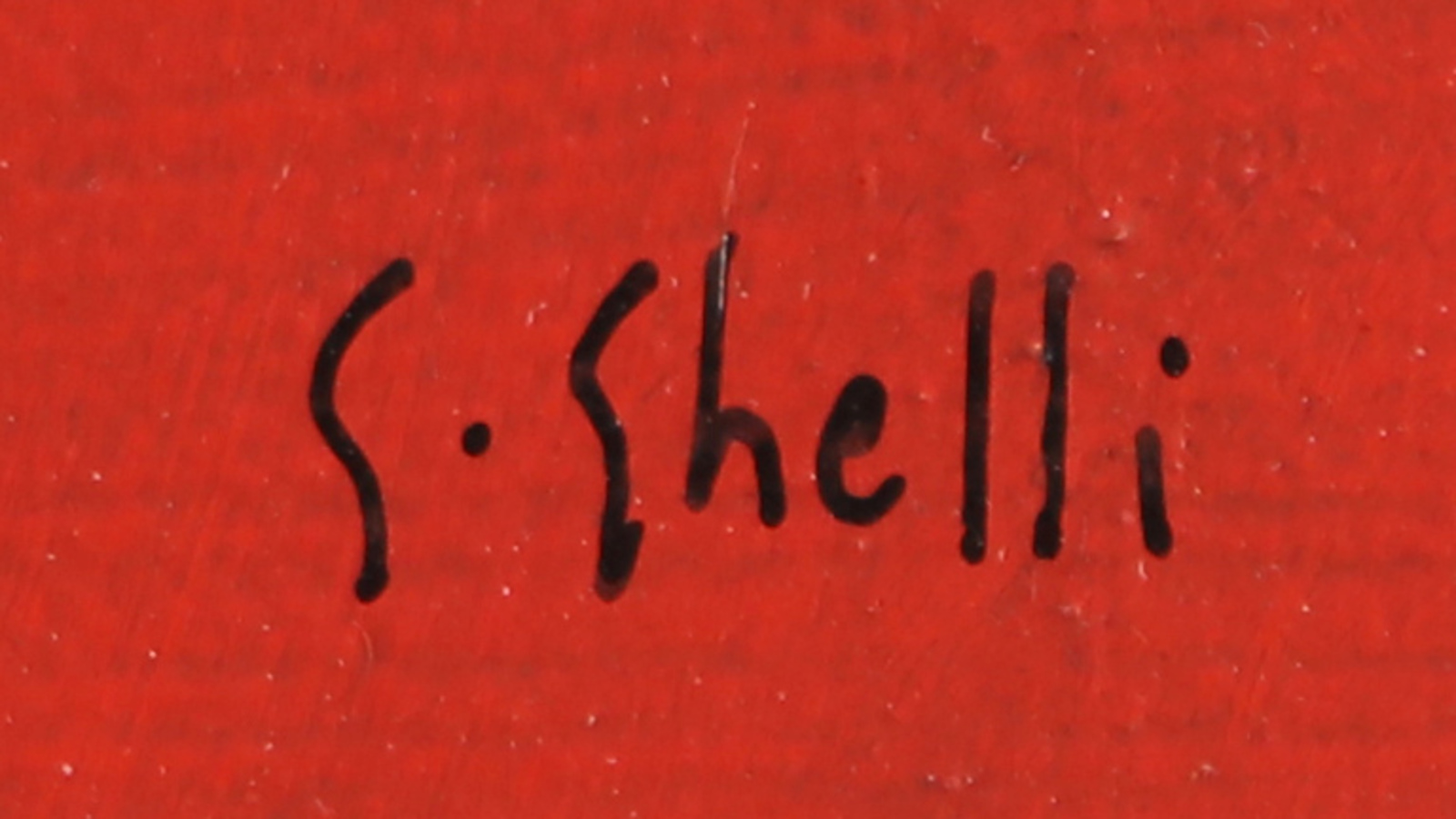 GHELLI GIULIANO Robot h. . Olio su tela . Cm 70,00 x 50,00. Firma in basso a destra. Al retro titolo e firma. Cornice presente