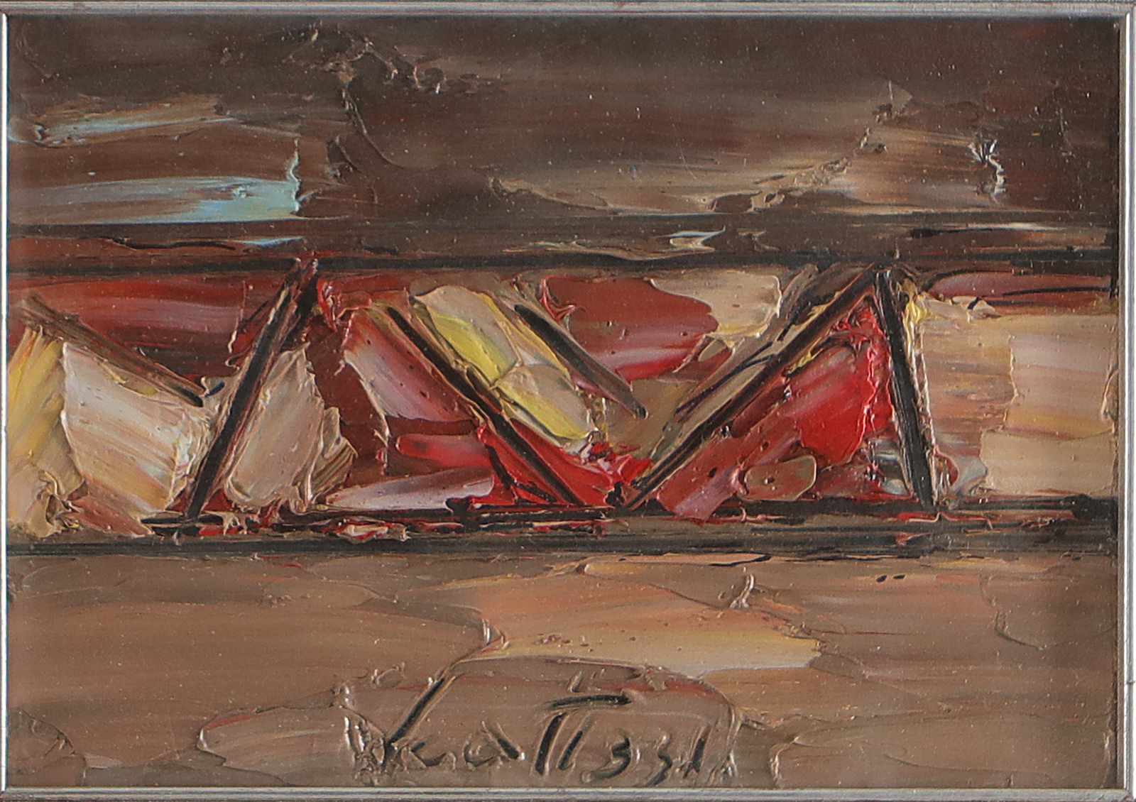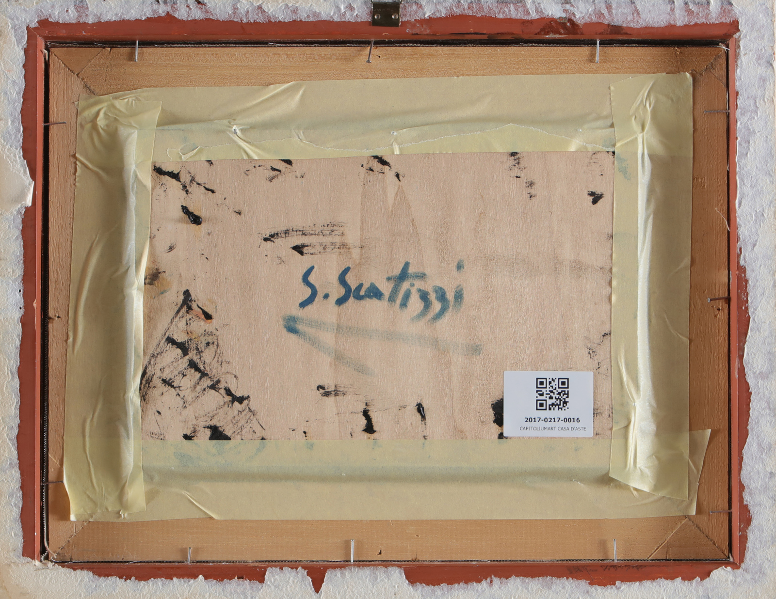 SCATIZZI SERGIO (1918 - 2009) Abstract. Oil on board. Cm 30,00 x 20,00. Signature lower and At the back. Artist's authenticity certificate on photo. Cornice presente