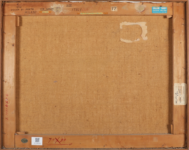 DI PRATA OSCAR (1910 - 2006) Senza titolo. . 1968. Olio su tela . Cm 90,00 x 70,00. Firma e anno in basso a sinistra. Al retro cartiglio descrittivo a cura della Galerie Tardy, Enschede. . Cornice presente