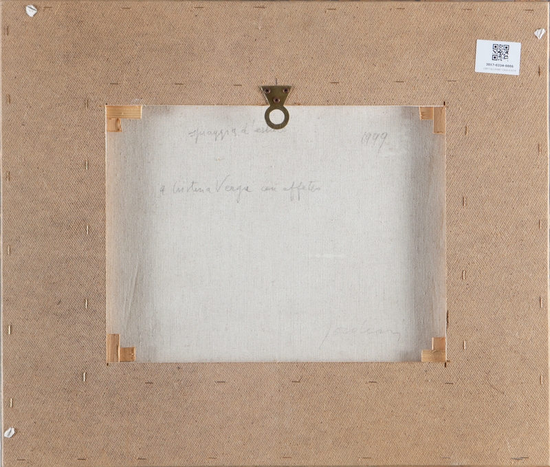 SORDINI ETTORE (n. 1934) Summer beach. 1999. Mixed media on canvas. Cm 40,00 x 48,00. At the back: title, signature, year and dedication.. Cornice presente
