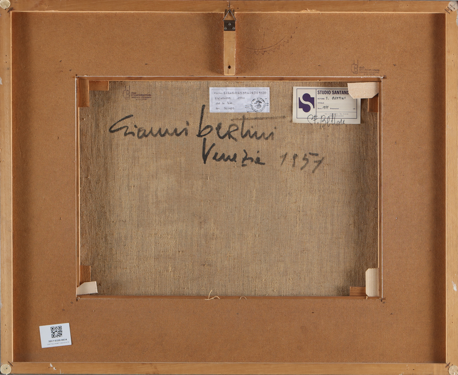 BERTINI GIANNI (1922 - 2010) Explosion. 1951. Mixed media on canvas paper. Cm 65,00 x 50,00. Signature and year lower right. At the back: signature, year. Studio Santandrea Milano, label; Archive Gianni Bertini label. Gianni Bertini Archives, Florence, uthenticity certificate on photograph. Cornice presente